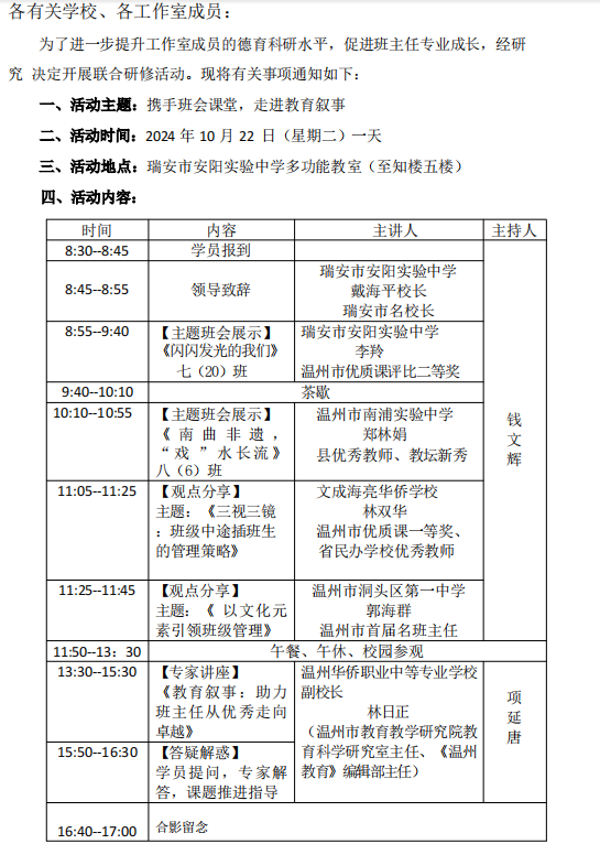 关于举行温州市项延唐初中名班主任工作室第32次活动的通知
