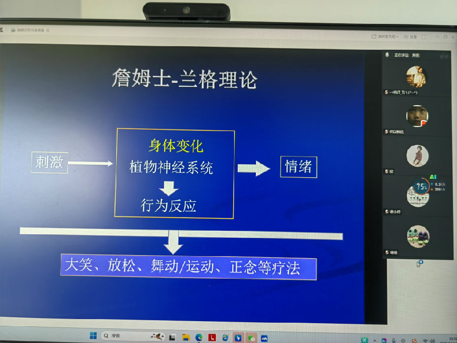 陈教授首先从经典情绪理论入手,系统梳理了詹姆士-兰格理论、坎农-巴德学说、阿诺德评定-兴奋理论以及沙赫特情绪三因素理论等,阐释了情绪如何由生理唤醒、认知评价与环境因素共同作用形成。他指出,传统理论虽能解释特定情境下的情绪反应,但在面对慢性情绪问题,尤其是学生群体中常见的焦虑、抑郁等问题时,仍存在局限。